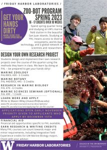 - At the 400 level, you can take our Zoo-Bot program, which is 16 credits worth of courses that will teach you the hands-on fundamentals of Zoology and Botany in this region while you design and conduct your own research project. Students in this program may be eligible for Mary Gates Endowment Scholarship.