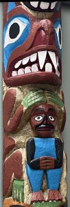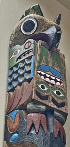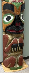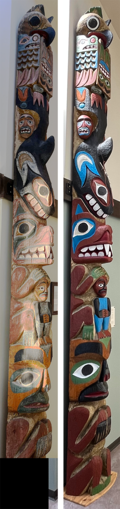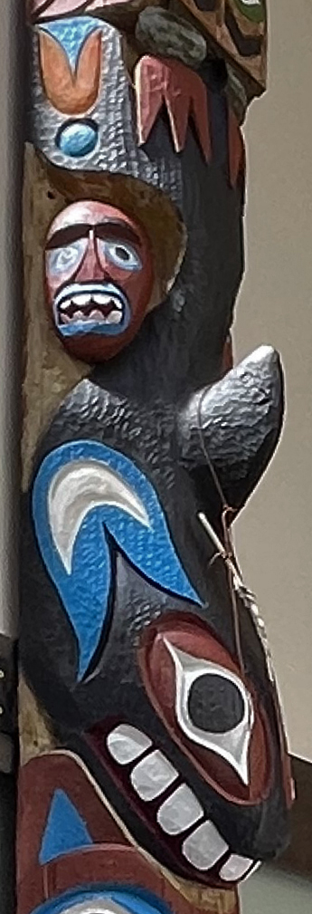 For those who haven’t been to FHL in the last 2 years, an amazing item now graces the entryway of the Fernald Building: a gorgeous totem pole. Dr. Eugene Nester, UW Emeritus Professor of Microbiology and long-term member of the Whiteley Center Administrative Committee, purchased the pole in Seattle from Darrel Norman, a Blackfeet artist. Mr. Norman told Dr. Nester that the pole had been owned by David Tobias, owner of the Seattle Tent and Awning Company, who built a resort near Mt. Rainier where the pole was displayed. It then went to Mr. Tobias’ daughter, who owned it for many years. She wanted to will it to the Burke Museum at UW, but the museum already had similar examples. Consequently Darrel Norman got it, and eventually sold it to Dr. Nester. Eugene Nester has spent many productive hours at the Whiteley Center at FHL and knew that the totem pole would be a beautiful and appreciated gift to our facility. He generously donated it in Fall 2022.