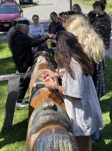 The restoration started with Rick putting his hand on the pole and saying a prayer in Ditidaht (his people’s language), and in his heart saying to his Uncle Wilson, “I wanna do what I can, Uncle.” He said “It’s always a must – if you’re going to repair someone’s work, say a prayer first before you even get to work on it. This is giving respect to that person.” The next step was looking for cedar chips to help fill missing pieces, especially in the bear’s ear and mouth; if he just poured in glue, it wouldn’t close. So, he patched it up, re-sanded it, and then repainted it with the help of FHL students and staff. He was delighted to draw on the students’ energy, and “to hear people say ‘Wow!! You brought it back to life!’ And I was like: ‘Yes! That’s what I wanted to hear!’”