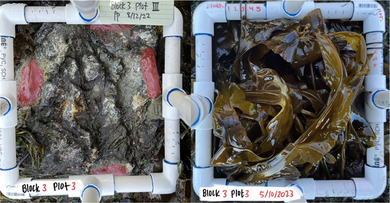 I joined the Lubchenco-Menge Lab at Oregon State University in the Fall of 2020. After a brief foray into coral reef ecology, I returned to FHL in 2022 to start a long-term field experiment on the southwest edge of San Juan Island, at a secluded site called Pile Point. I wanted to better understand the mechanism behind the positive association between corallines and Hedophyllum. I was especially interested in two aspects of this relationship: the effect of grazing by the chiton Katharina tunicata on Hedophyllum recruitment (success of young individuals), and the role of gametophyte “seed banks” which aid in the re-establishment of a population after the kelp are removed. To evaluate these factors and their interactive effects, I removed adult Hedophyllum from plots with corallines, plots without corallines, and plots that were sterilized to remove gametophytes. I then studied the effect of grazers on the recovery process in each, by revisiting my experiment roughly every month for one year to record new kelp growth, document the community recovery process by photographing the plots, and take DNA swabs to monitor the presence of gametophytes.