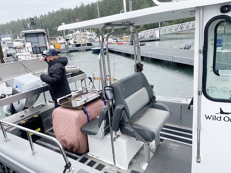 Giles and her trusty whale-scat-detector dog Eba are using novel ways to monitor the health of Southern Resident killer whales using whale scat samples collected from her boat. You can learn a great deal about a whale’s health and their prey from these samples, which are stored in ice and sent to a lab in San Diego for analysis. When I met Eba, I found a beautiful, eleven-year-old rat terrier. Once, she was a lethargic puppy who weighed in at just 3 ½ pounds when she was abandoned at a Sacramento animal shelter, before being adopted by Giles. Giles also named her whale detection boat Cheena, after another beloved dog.