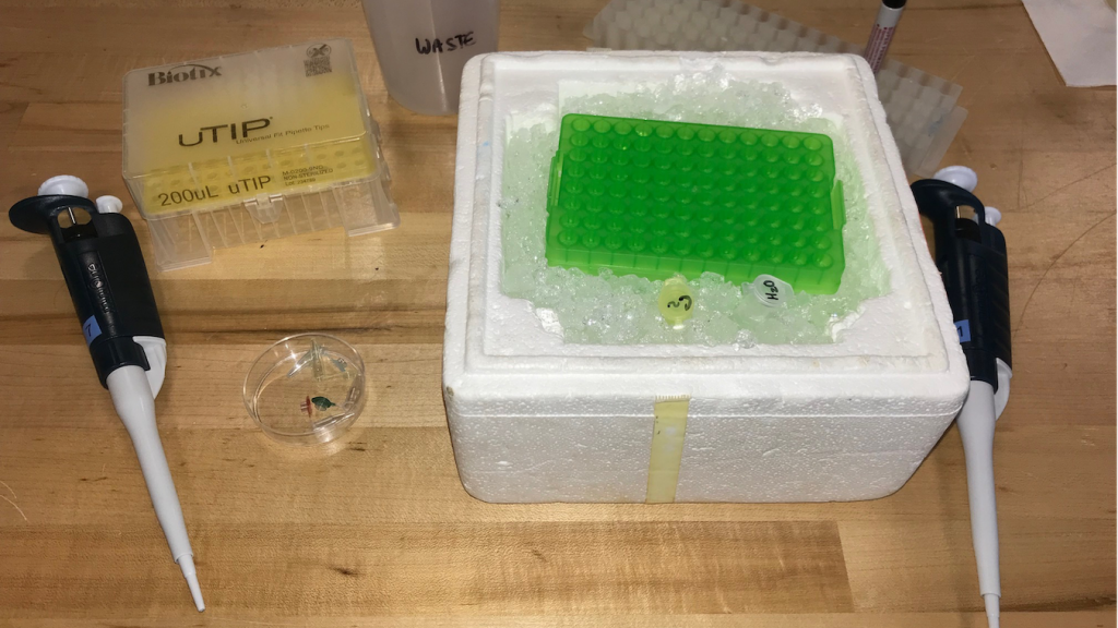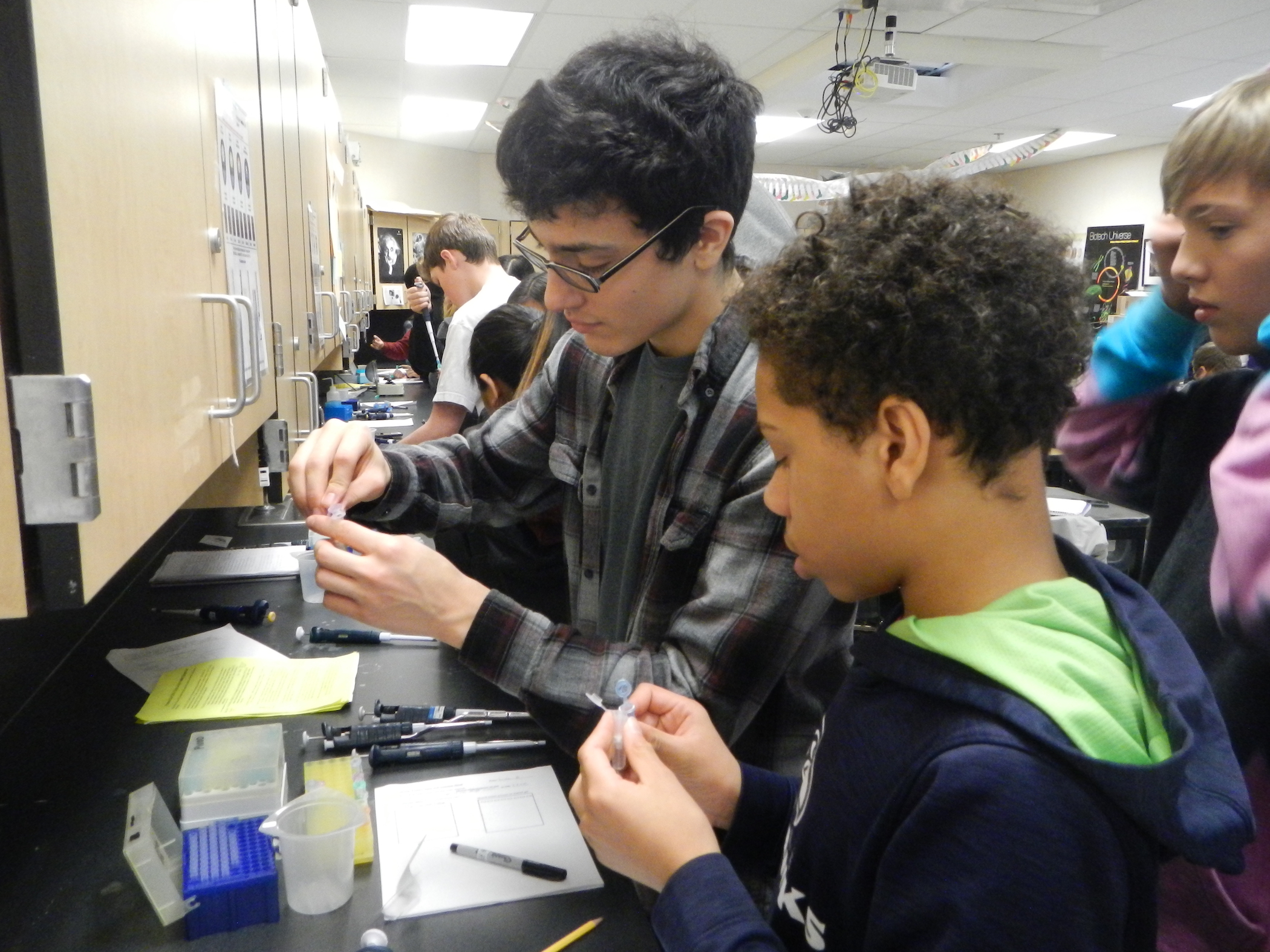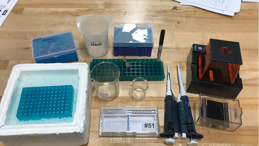 Students working on the IMP project use a variety of advanced scientific tools, shown in the pictures above. Materials include precision micropippeters, agarose gel casts, electrophoresis chambers and specialized gel viewing chambers designed to filter out blue light to highlight DNA fingerprints.