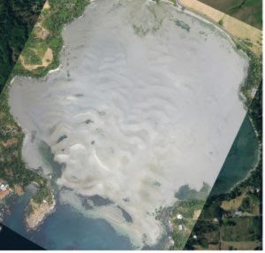 False Bay, San Juan Island. Eelgrass patches are located at the bottom of the photo above the water line. (Photo by Gregg Ridder 2017) and field work in eelgrass meadows (Photo by Kendall Valentine).