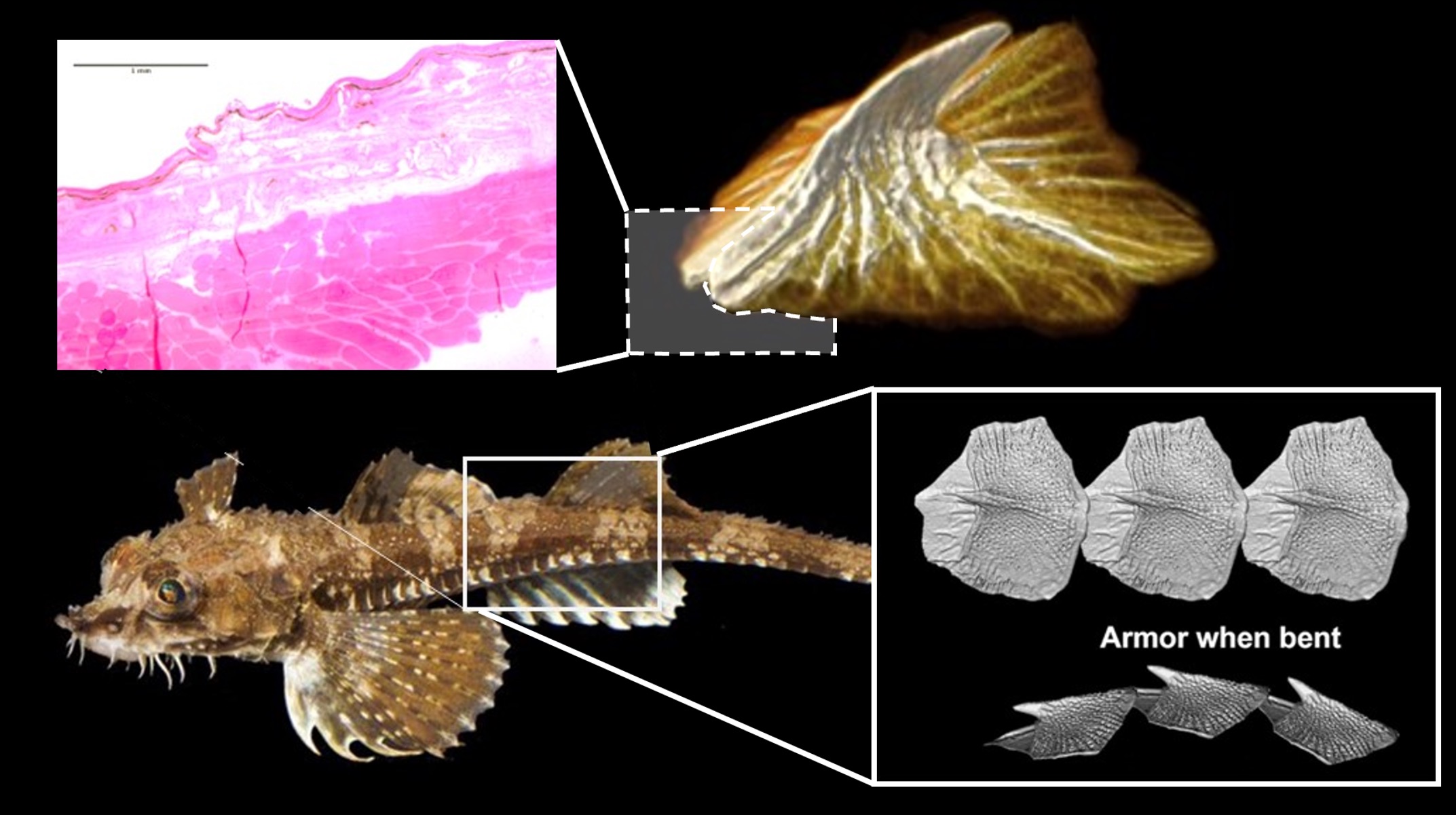 Many fish species have evolved bony armor (scales and plates) covering their bodies from head to tail. This sort of armor has been around for hundreds of millions of years and provides protection. Recent studies have revealed that fish armor is multifunctional and provides many other adaptive benefits to fishes. One of those benefits might be elastic energy storage – a way that fishes can capture and redirect energy during swimming. The spring-like tissues (collagen) connecting individual armor plates interact with the armor itself to make a multipurpose composite – in other words, hard and soft tissues work together to make behaviors like swimming more efficient. Our goal is to understand whether elastic storage is present in fish armors and to what extent this storage is mediated by either the hard tissues (armor) or soft tissue (collagen) components of the system.