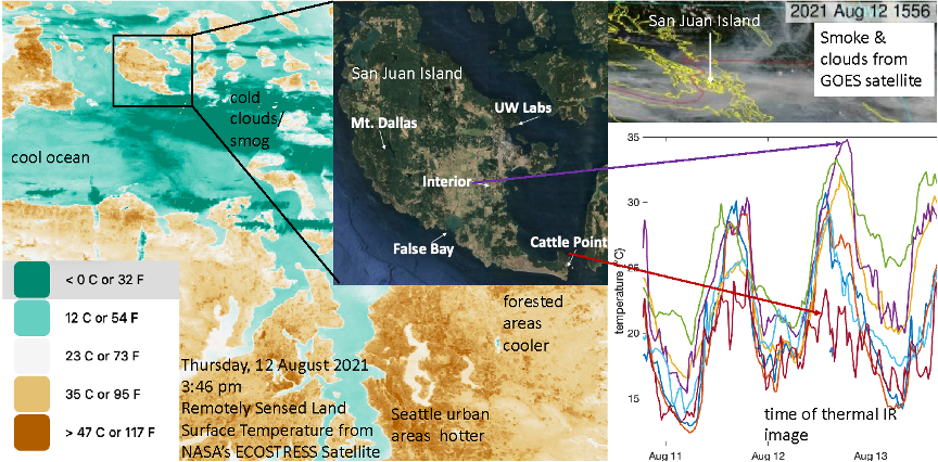 Marine stratus and coastal fog are common along the western U.S. coast, but studies disagree about whether fog frequency is increasing or decreasing. This marine boundary layer is fast-moving, hard to forecast, a hazard for air and sea navigation, and provides huge contrasts in air temperatures during summer heat waves. While most prior studies have focused on California, fog and humidity are more critical to Washington area intertidal organisms due to the timing of the tides. For example, Friday Harbor and Seattle, Washington have over twice as many hours of midday low tide exposure as most California locations (Helmuth et al., 2002). For this project, undergraduate interns will deploy and collect timelapse cameras along with air temperature and relative humidity sensors at coastal and interior sites across San Juan Island, adding data to measurements taken since summer 2021. Interns will analyze this data in the context of regional winds, tides, and heat waves to understand when and where small-scale temperature variations matter the most to local ecology. Interns will work with python programming tutorials to process GOES, VIIRS, and ECOSTRESS satellite data to put the local observations in a regional context and better understand both the accuracy of remote sensing products and what controls the extent and duration of summer temperature peaks and marine cloud cover (see example imagery below, highlighting 15°C (27°F) variation in peak temperatures across San Juan Island on 12 August 2021).  Prior programming experience is a plus but not required; anyone with an interest to learn is encouraged to apply.