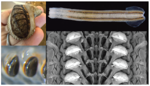 Figure: the iron teeth of chitons. Clockwise from top left, a chiton at FHL, a radula, an SEM image of chiton teeth, and light microscopy showing the shiny, black iron.